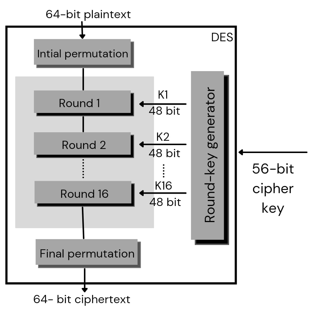 Consider from here, Information encryption standard (DES) has been found defenseless against extremely amazing assaults and hence, the ubiquity of DES has been discovered somewhat on decay. DES is a square code, and scrambles information in squares of size of 64 digit each, which means 64 pieces of plain content goes as the contribution to DES, which produces 64 pieces of code text. A similar calculation and key are utilized for encryption and unscrambling, with minor contrasts.